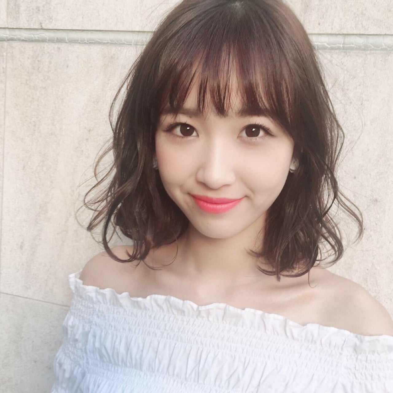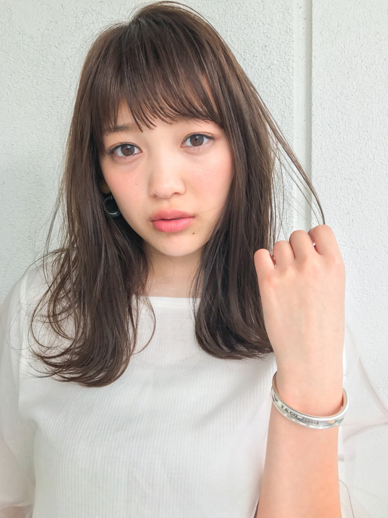 大人っぽいミディアムヘアにベビーバングを合わせて、グッと大人かわいさがUPするスタイル。