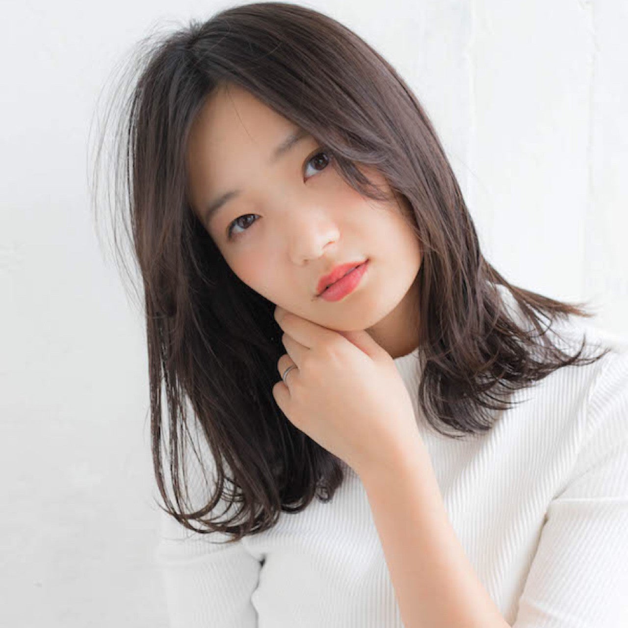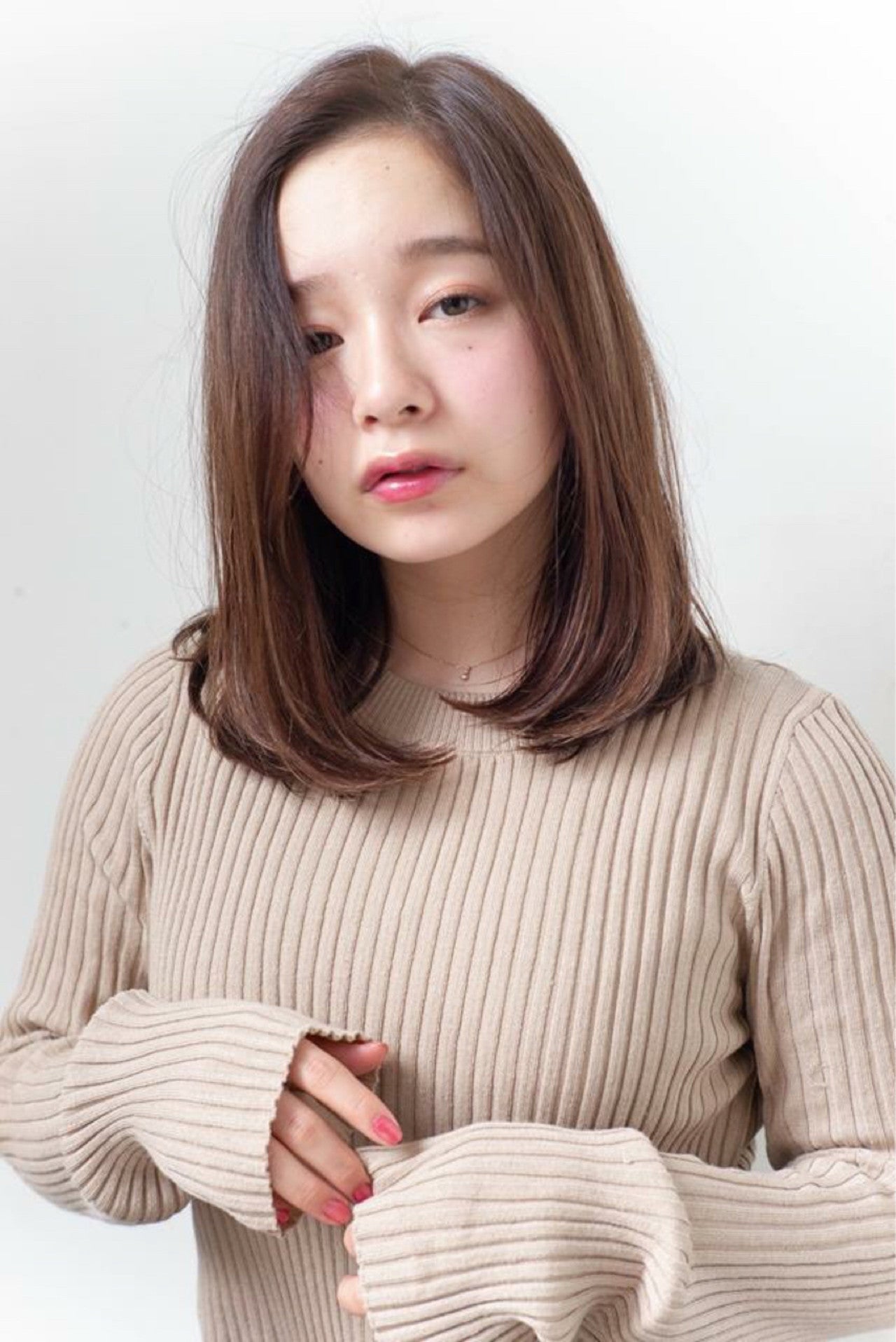 切りっぱなしミディアムはちょっぴりモードな印象に。しっかり巻かずにストレートめに仕上げるのがポイント。