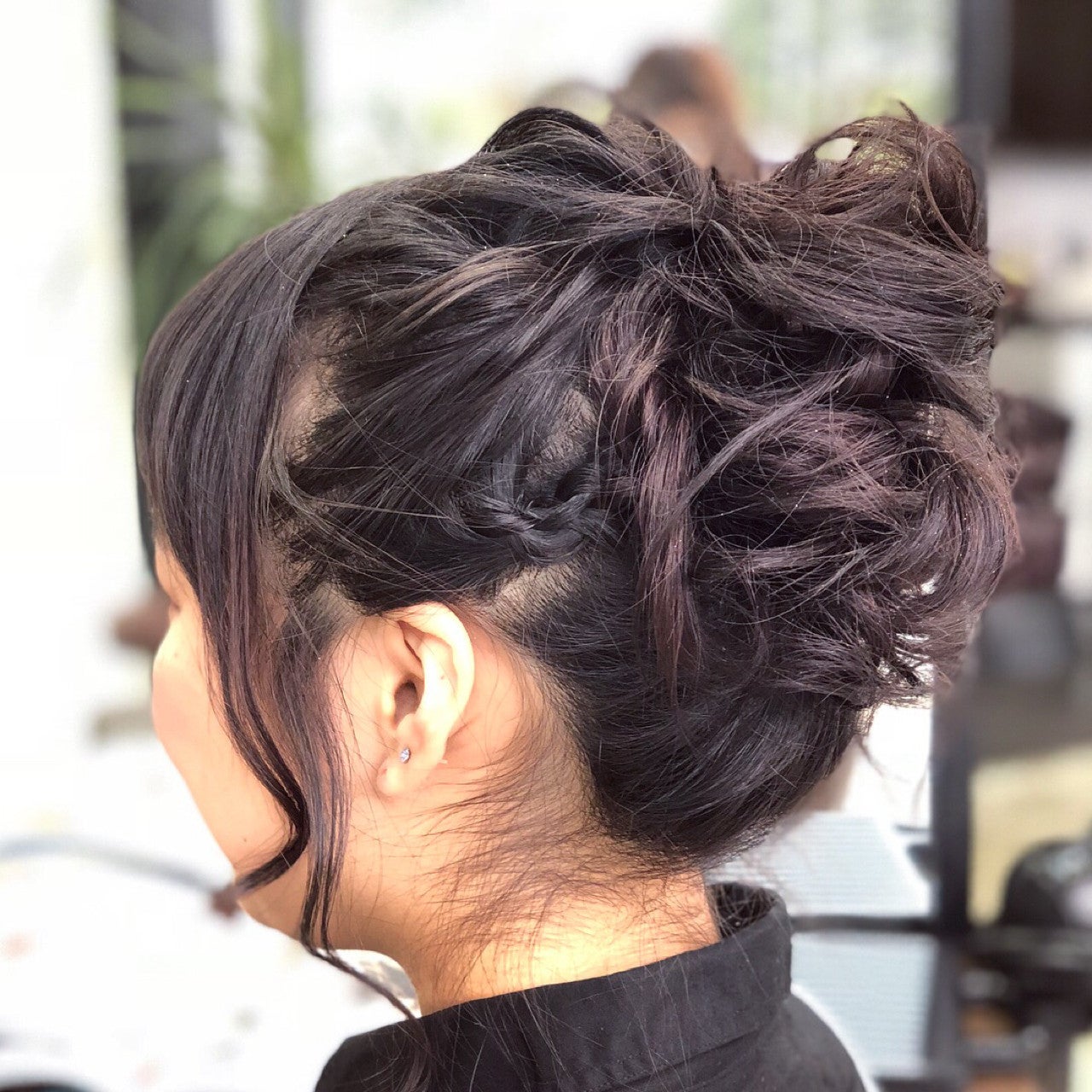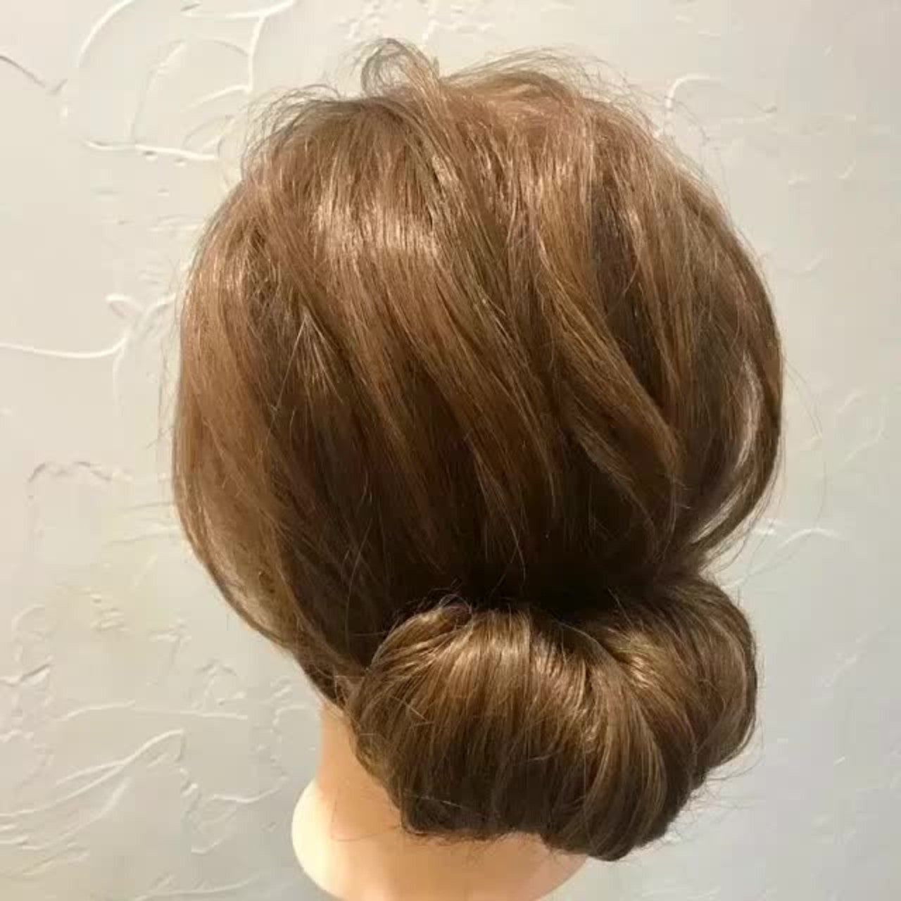 結婚式など華やかなシーンにおすすめのお団子ヘアです。後れ毛をバランスよく巻くことで品の良さを演出できます。
