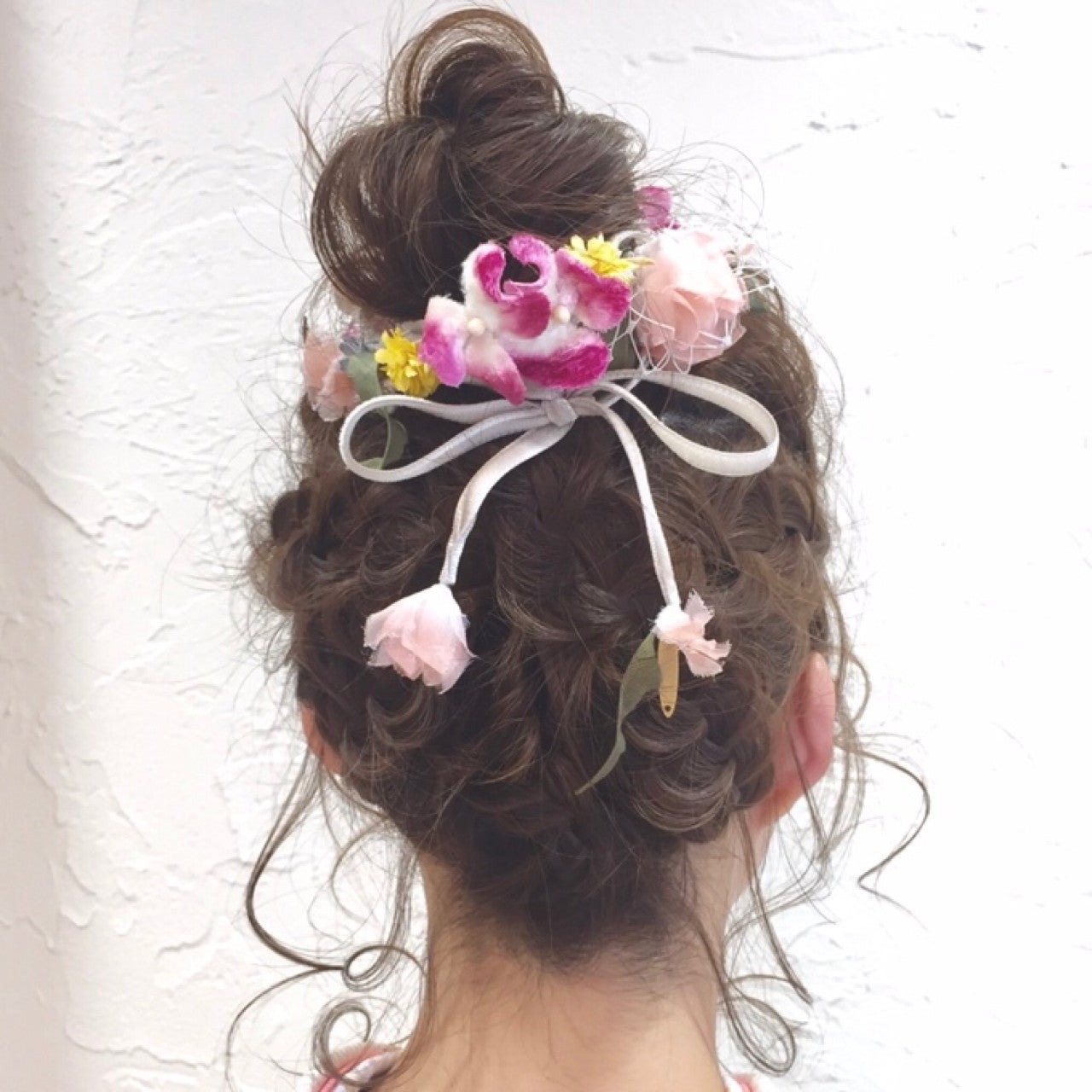 お団子の根元部分に華やかなフラワーアレンジメントをあしらっています。結婚式や成人式などにもおすすめです。