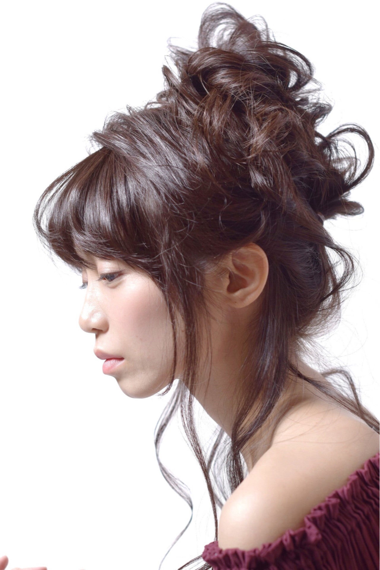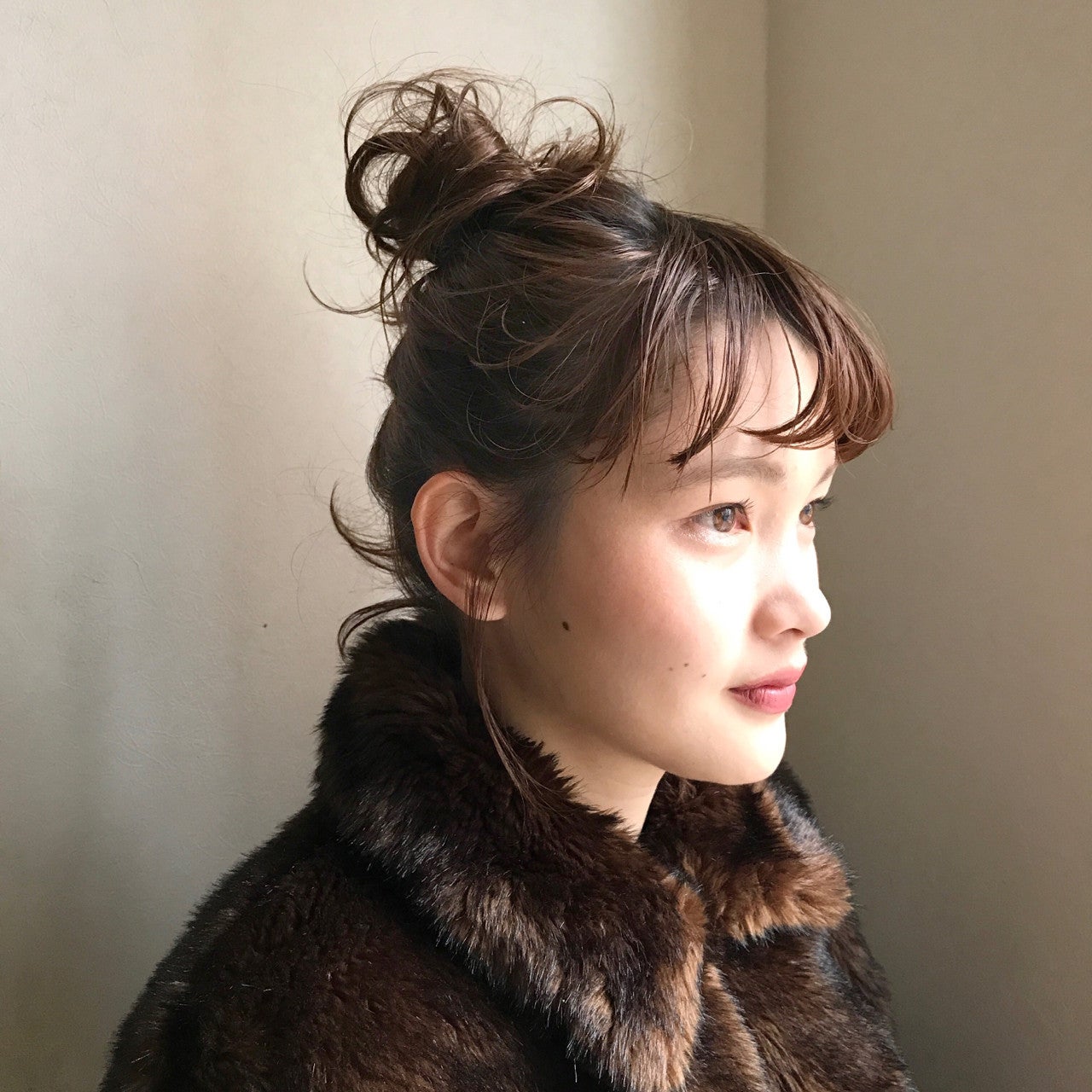 高めの位置でつくるお団子アレンジです。毛先を巻いておくことで、こなれ感を演出できます。