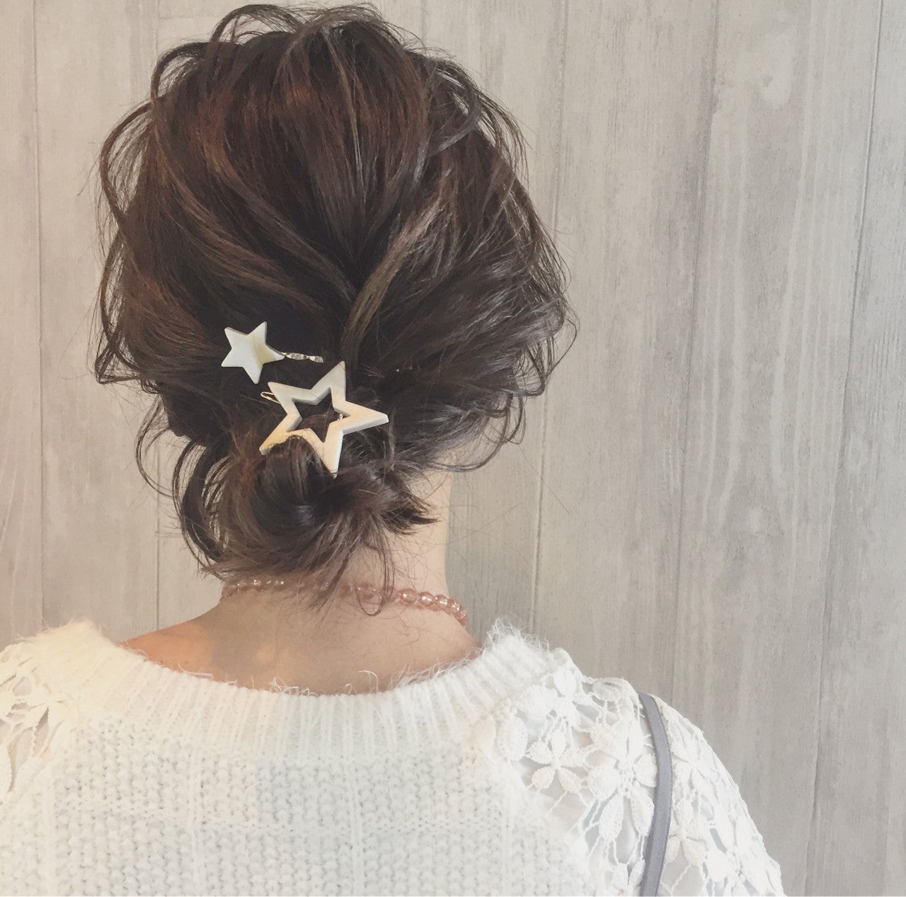 低めの位置でつくるお団子の簡単アレンジです。大きめのアクセでゴムを隠すのがポイント。