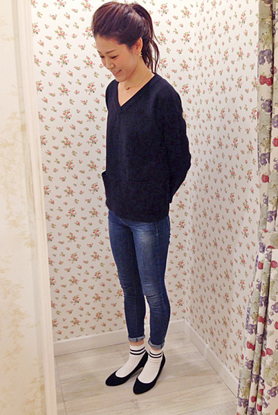 定番の黒パンプスで、ビジネスカジュアルのコーディネートを