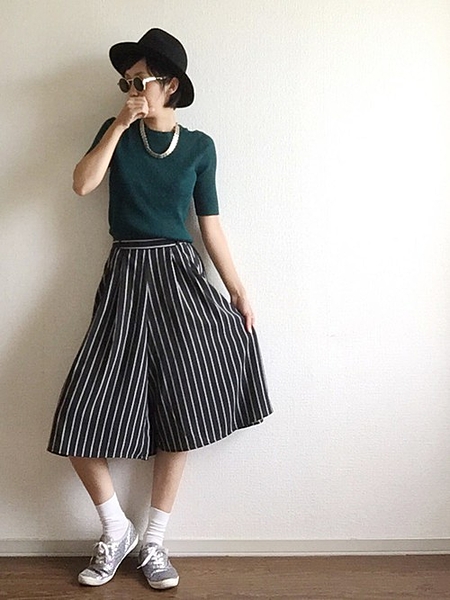 ダークグリーンのボトムスは、