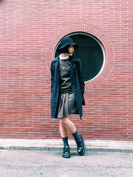 ワンピースにはチェック柄のチェスターコートや