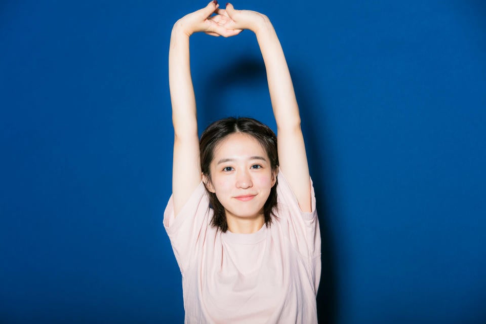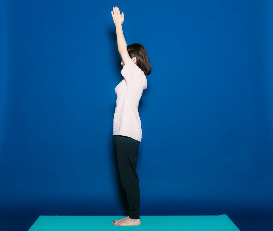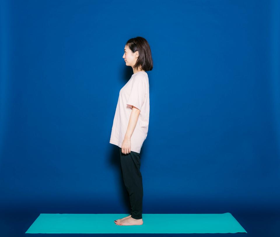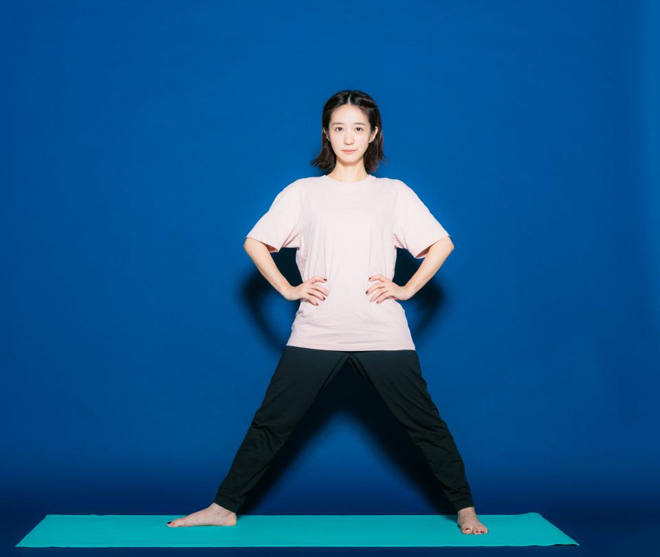 両手を腰に当て、お腹を引き上げて尾骨を下げ、背筋を伸ばし、姿勢を整える