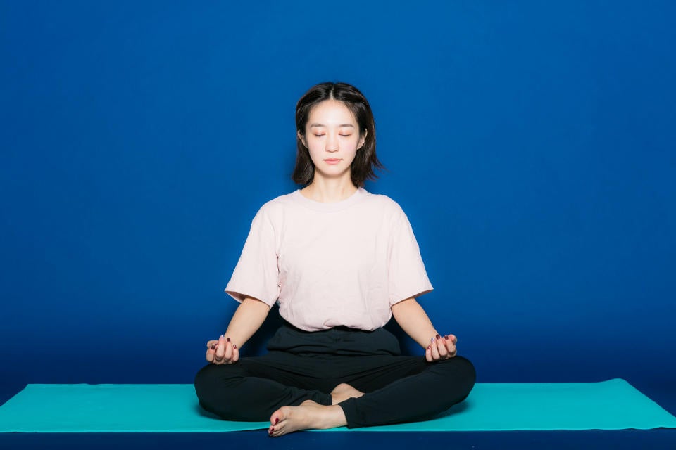 ヨガのポーズを行う前にあぐらの姿勢を作り呼吸を行います。