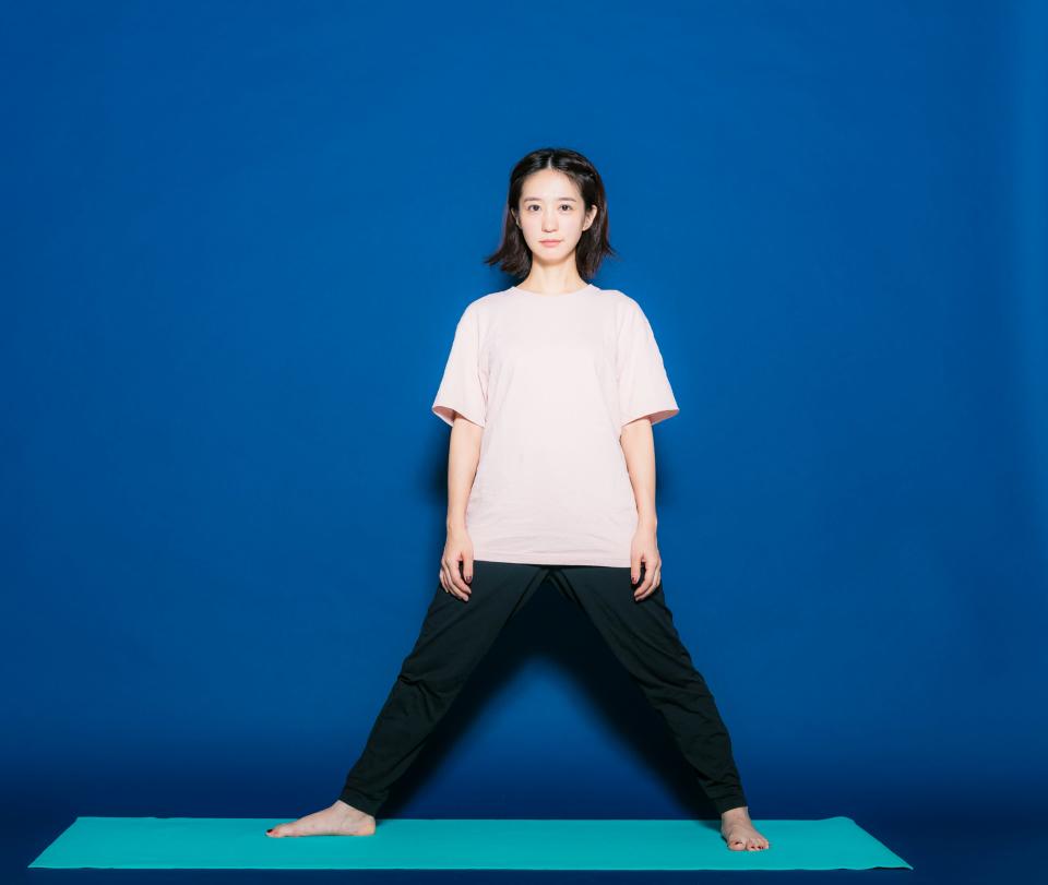 足は拳が一個入るくらい開き、お腹を引き上げて尾骨を下げ胸も引き上げて、上から頭を引っ張られるようなイメージで背筋を伸ばします。