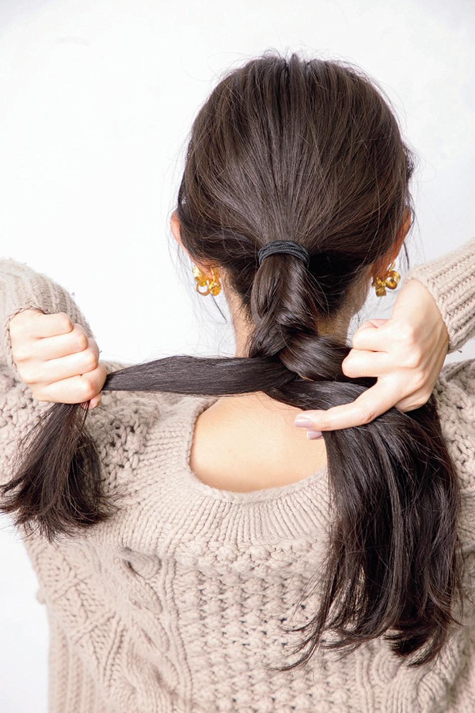 ②後ろに集めた毛束を三つ編みに。