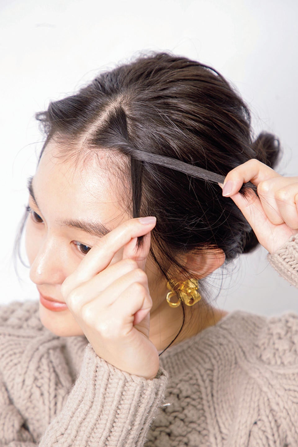 ③おだんごができたら、前髪をセンター分けに。