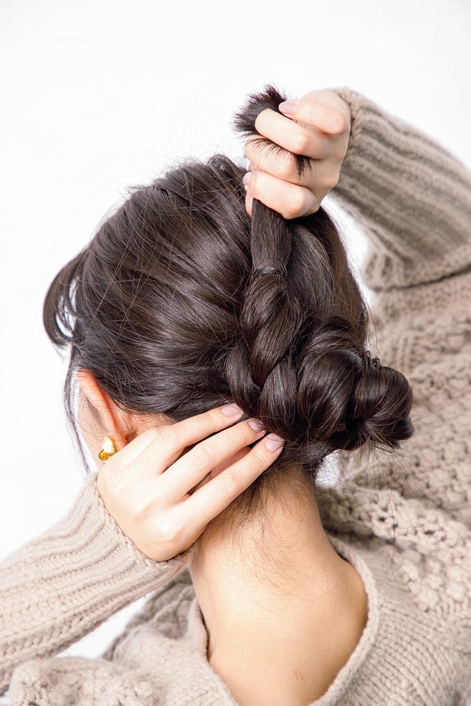 ②三つ編みの毛先を持ち、根元から結び目に毛束を巻きつけていきます。
