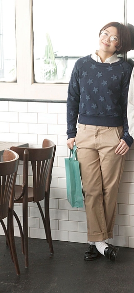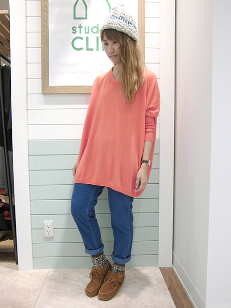 色合いを柔らかくする事で明るいニットカーディガンと合せるとよりおしゃれにコーディネートできますよ♪