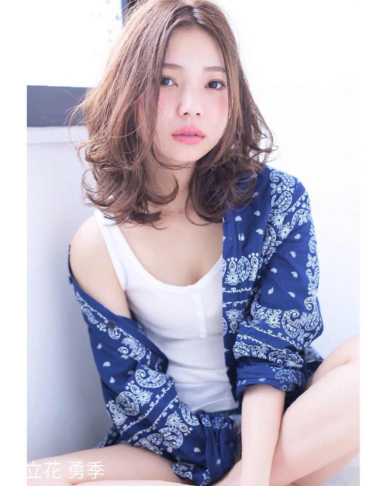 輪郭を包み込むパーマヘアとセンター分けの組み合わせは。柔らかで優しい印象を与えます。