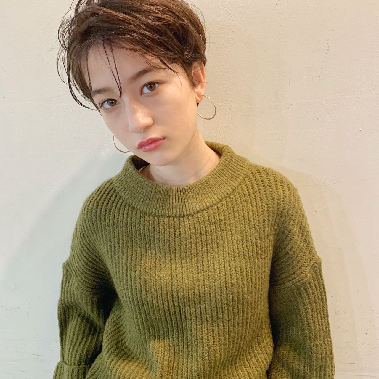 かき上げバングがおしゃれなショートヘア。ウェットなスタイリング剤で束感をプラスすればさらにこなれた印象に♡