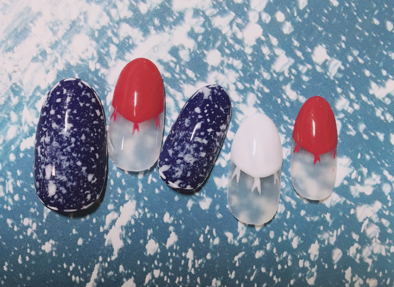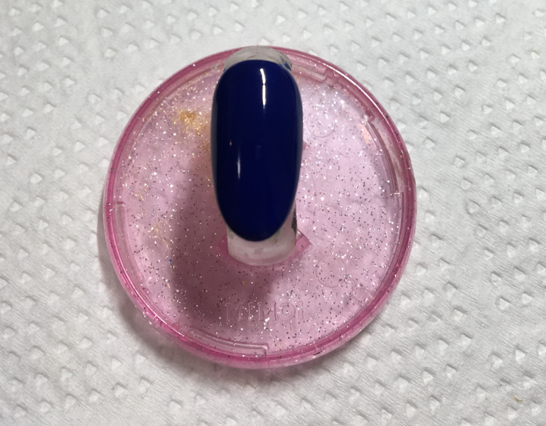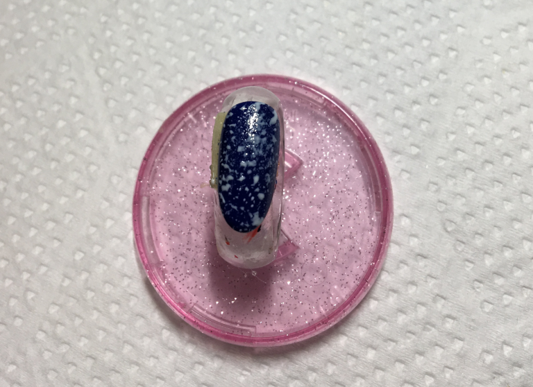 3. スポンジにホワイトのジェルをつけて、ネイビーを塗ったチップの上にポンポンしていきます。スポンジにジェルをつけるときは、アルミの上にジェルを少量取り、そこでつけるようにすると、つけすぎることがないので、初心者さんにもおすすめですよ!