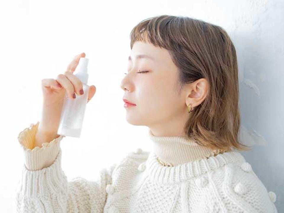 「オイルインウォーターを肌にたっぷり吹きかけて、手のひらでしっかり浸透させます。仕上げに乳液でフタをすれば1日中乾燥知らず!」