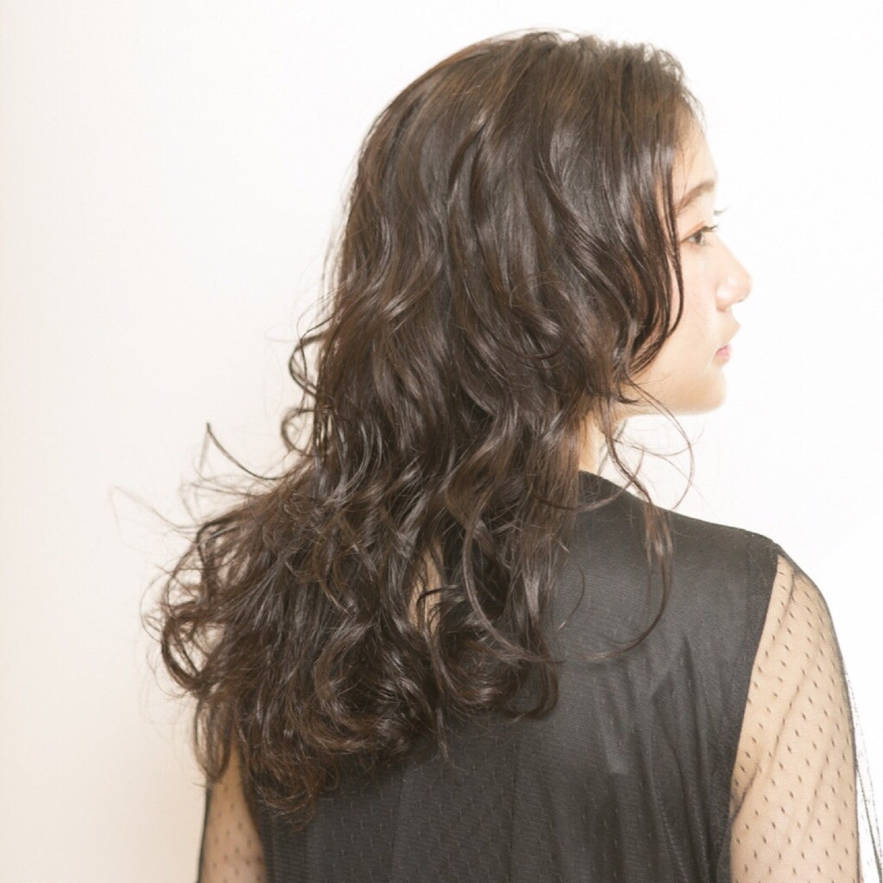 揺れウェーブでボリューミーにつくったロングヘアは、ブラックヘアによく似合うスタイルです。