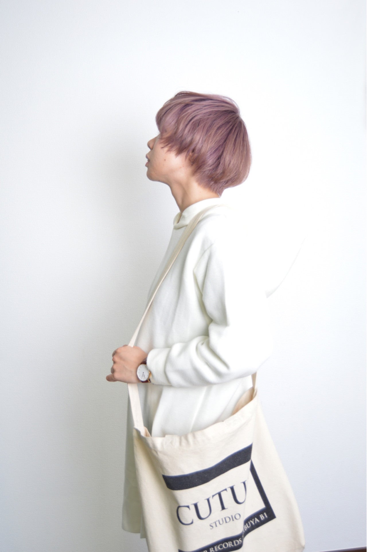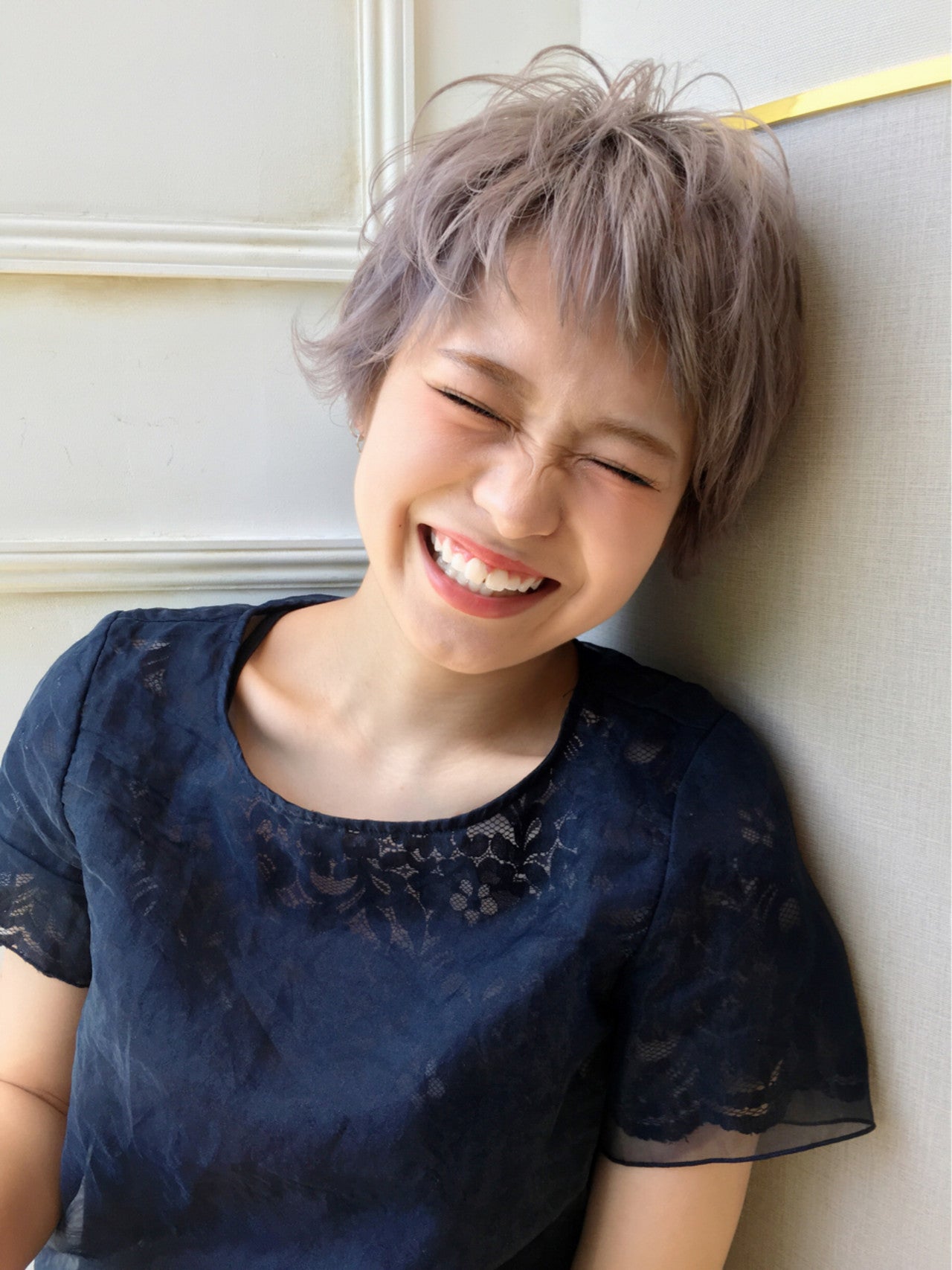 ショートヘアをホワイトブリーチし、外国人風のホワイトラベンダーで仕上げています。ストリート系のカジュアルファッションによく似合います。