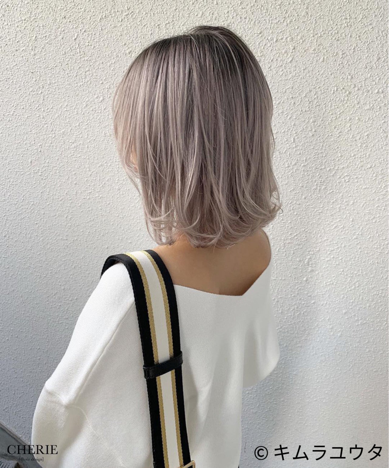 ホワイトブリーチしたミディアムヘアをホワイトラベンダーで仕上げた透明感溢れるスタイルです。髪の透け感がポイントになります。