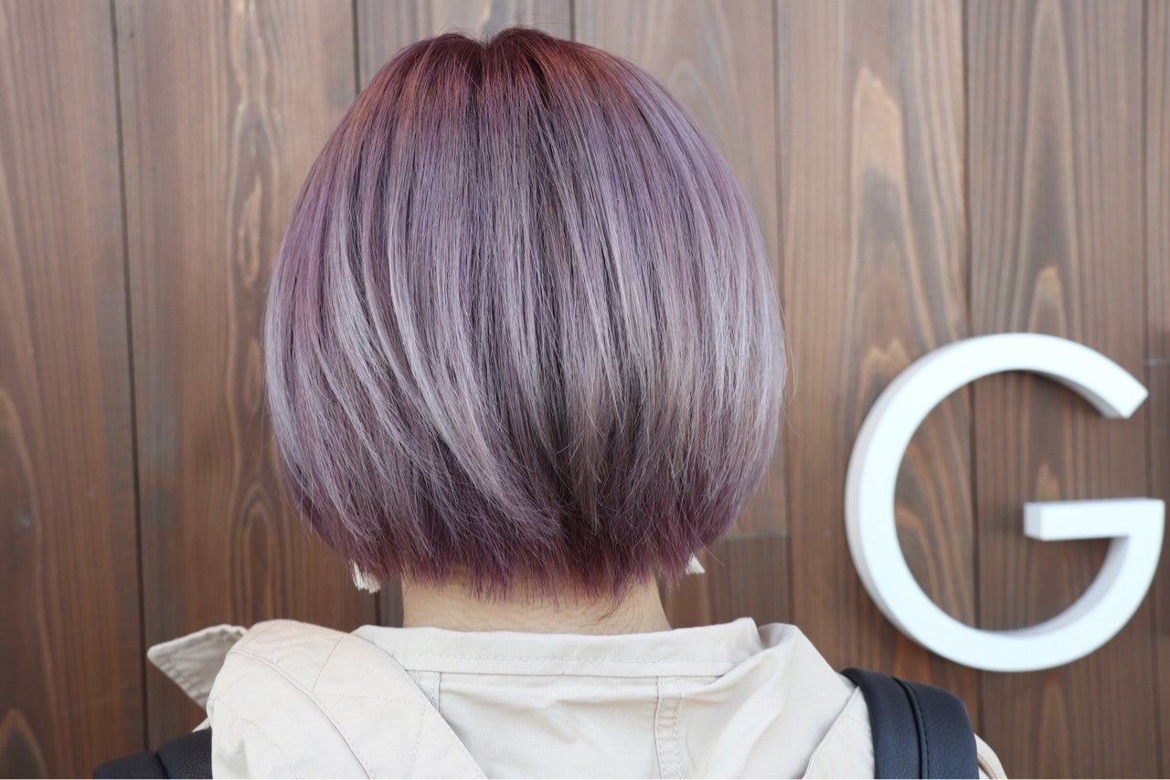 ツヤツヤとキレイな外国人風ボブに仕上がるのも、ラベンダーアッシュカラーにしているから。ストリート系のファッションにも良く似合いますよ。