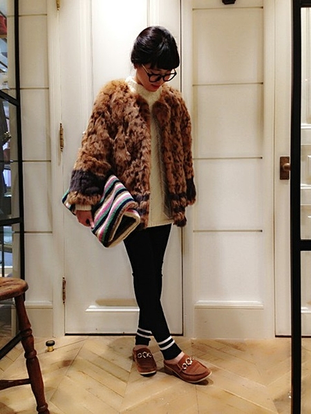 黒髪にも金髪にも似合うキャメルのファーコートは