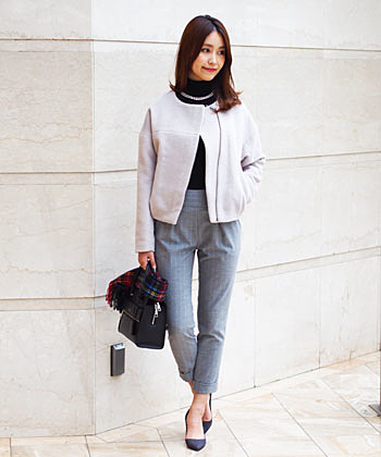 ノーカラーコート風のホワイトブルゾンです。ノーカラーブルゾンは嬢様スタイルにとっても合います。