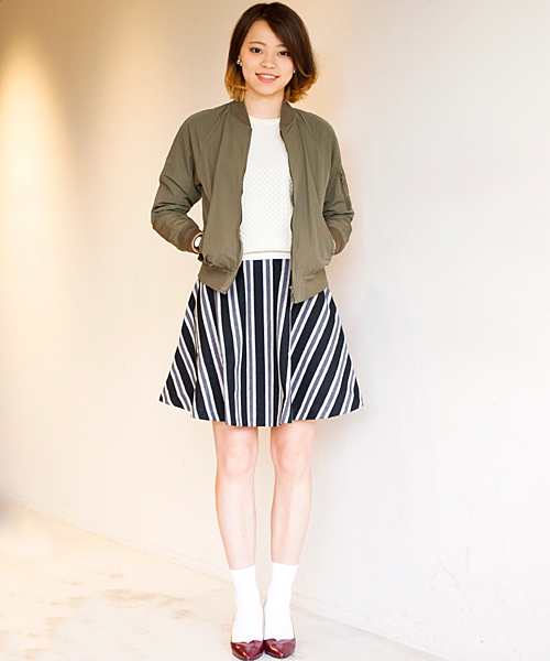 短め丈で軽いので、パンツの着こなしだけではなく、スカートにも合いますよ。