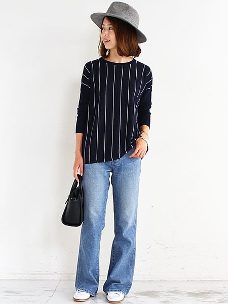シンプルな丸首のニットですが、薄くて軽いのにとても暖かいです。寒い時は中にシャツを合わせても良いでしょう。