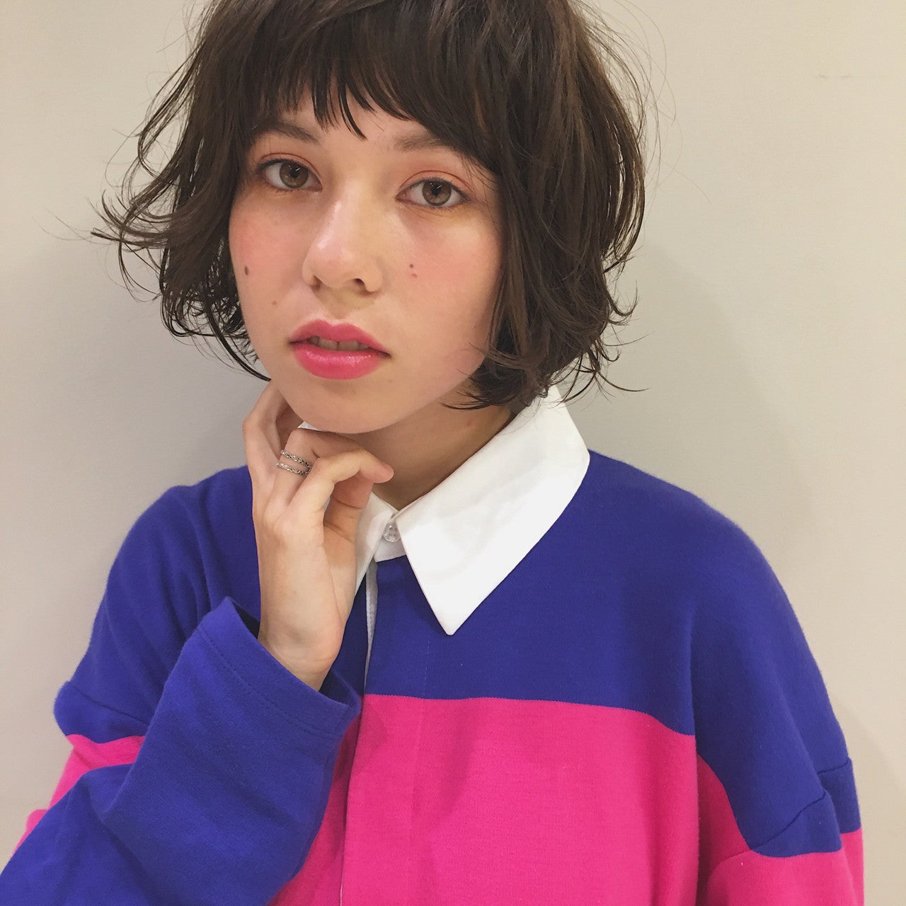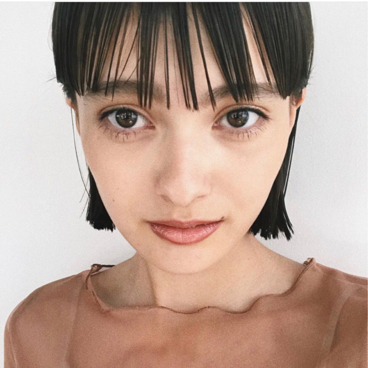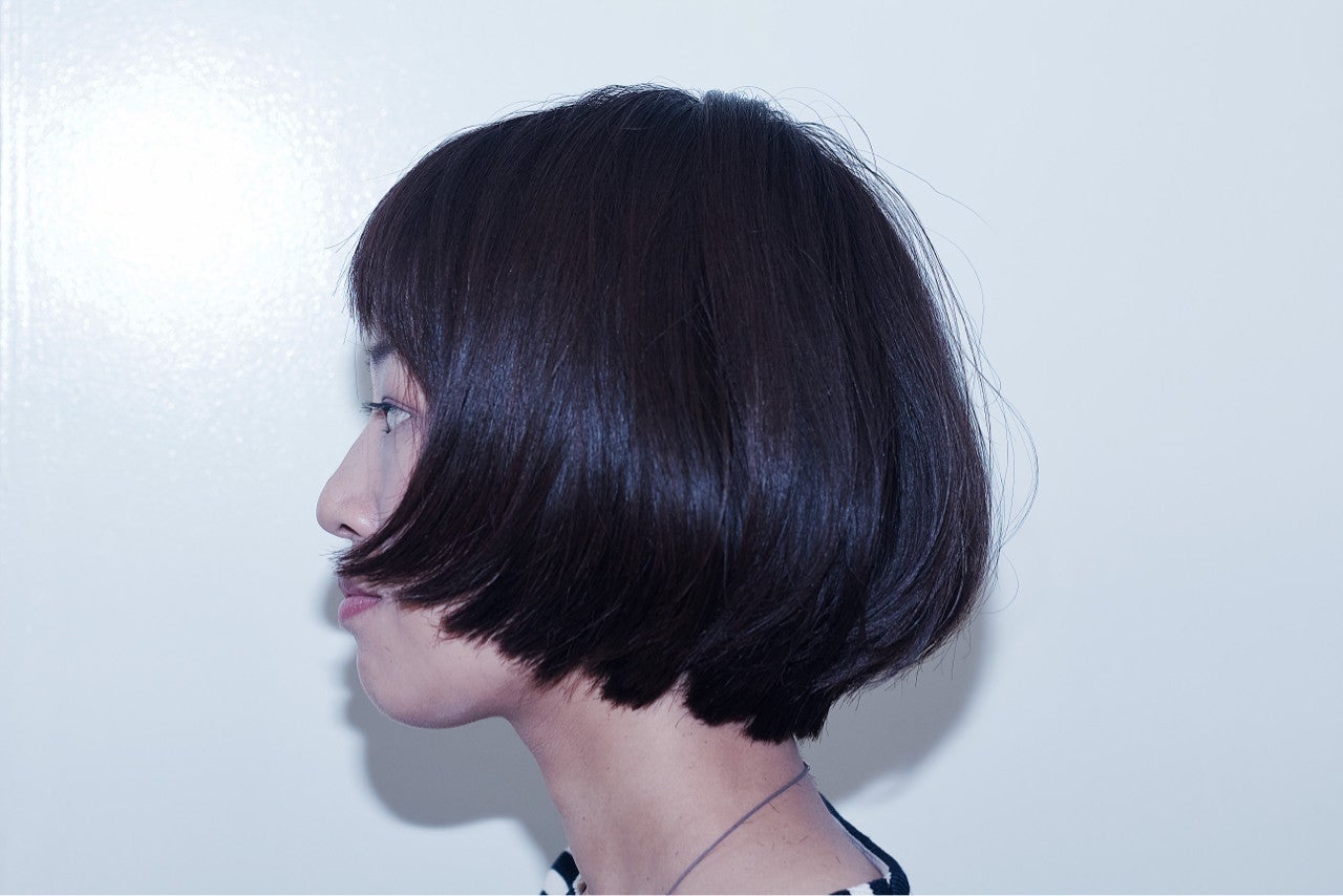 切りっぱなしボブにぱっつんバングを組み合わせています。モード系ファッションや辛口メイクとの相性がいいスタイルです。