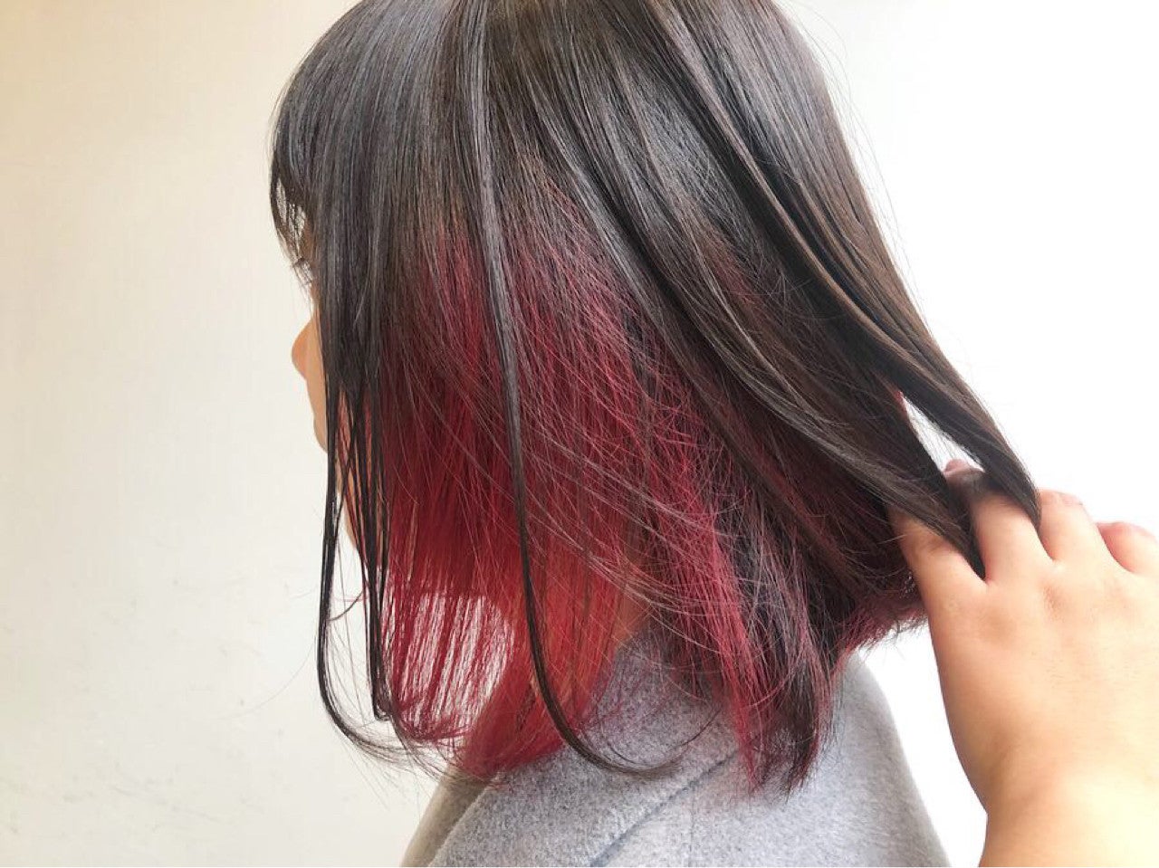 インナーカラーに鮮やかなレッドを選んでいます。かき上げる度にレッドカラーがチラ見えしますよ。