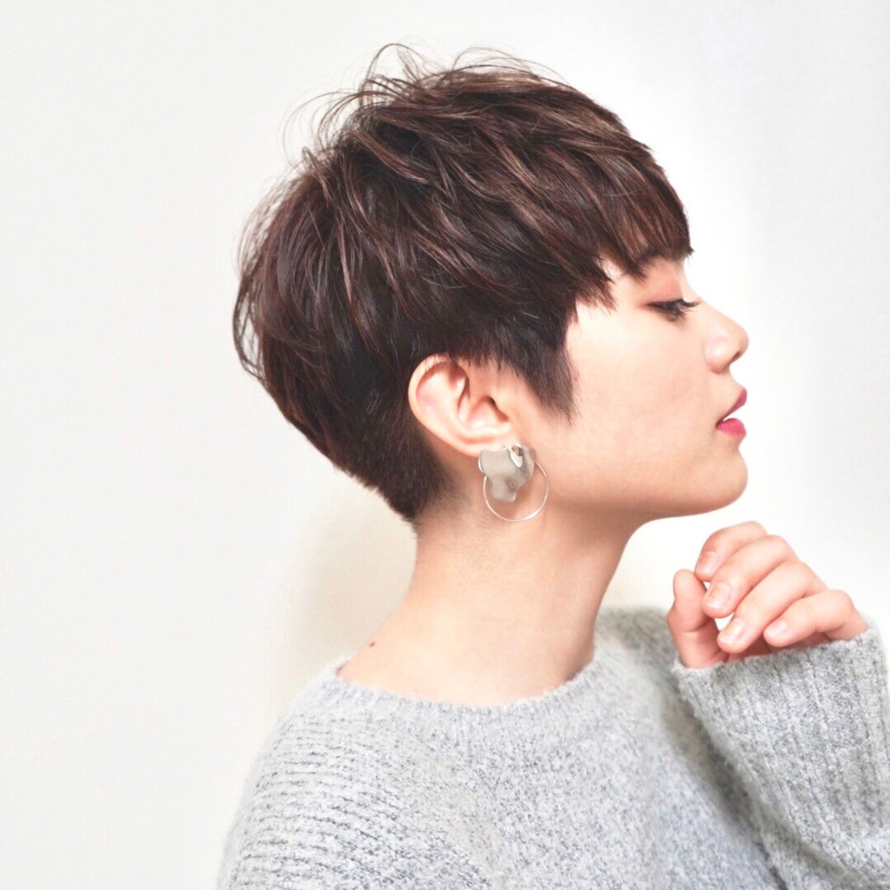 うなじがきれいに見えるモード系アレンジです。大きめピアスとの相性が抜群ですよ。
