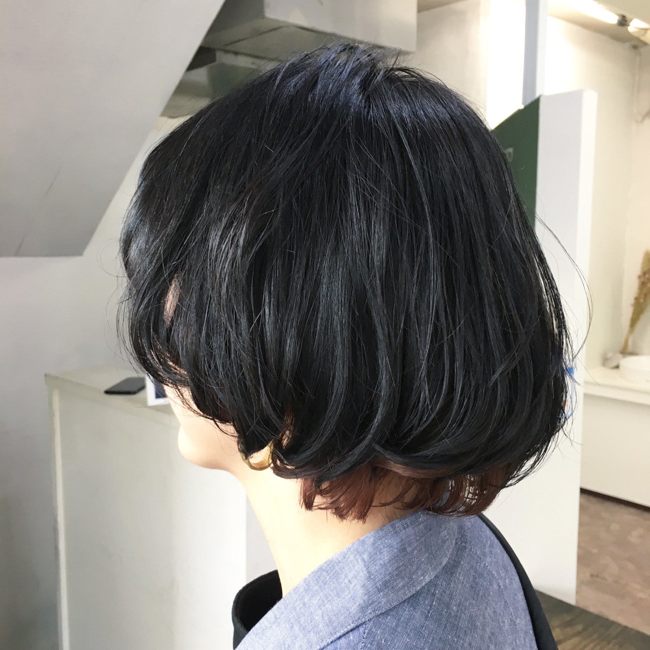 黒髪の毛先にインナーカラーを入れたマッシュボブ。黒髪もほんのり明るい印象に仕上がります。