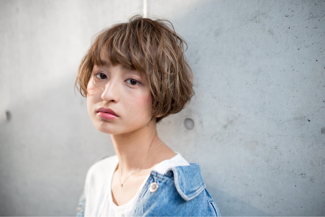 毛先だけにパーマをかけたストレートマッシュショート。ストレート効果でハイライトが引き立ちます♡