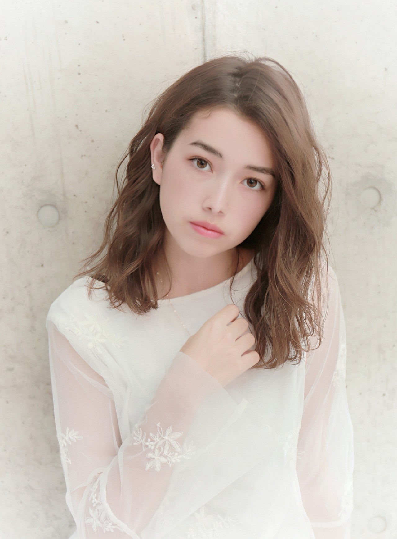 セミロングでつくるふんわりフェミニンなウェーブヘアです。フェミニンなファッションにもおすすめです。