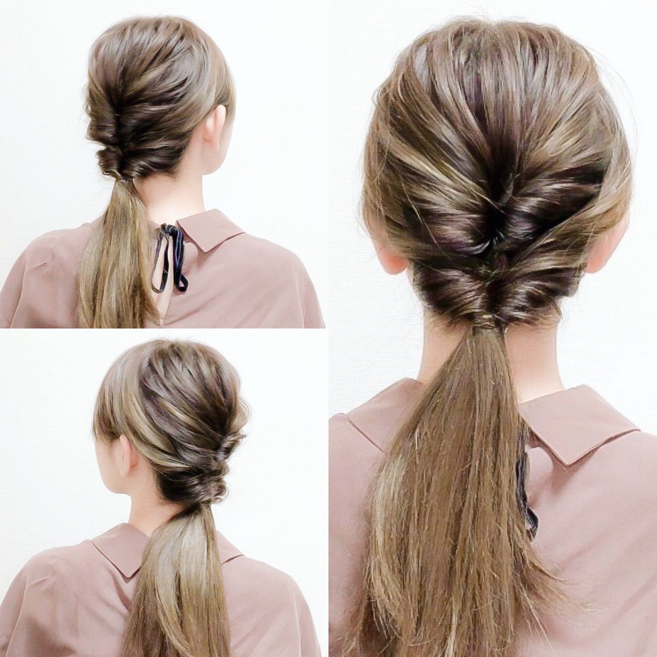 くるりんぱを2回するだけの簡単アレンジです。ピンを使わないのも嬉しいですね。バランスよく髪の毛を引き出してやるのがポイントです。