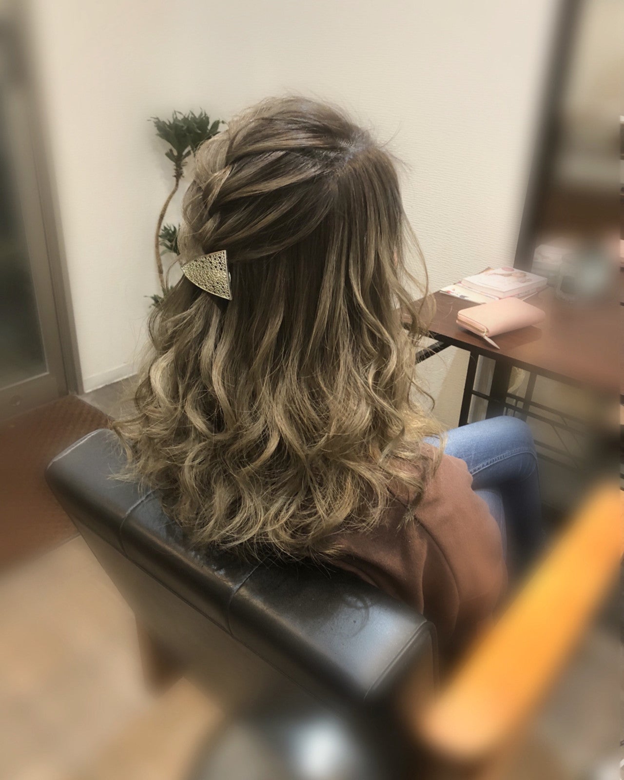 トップの高い位置からふんわり編み込んだハーフアップ♡髪色とバレッタのカラー合わせがステキ!