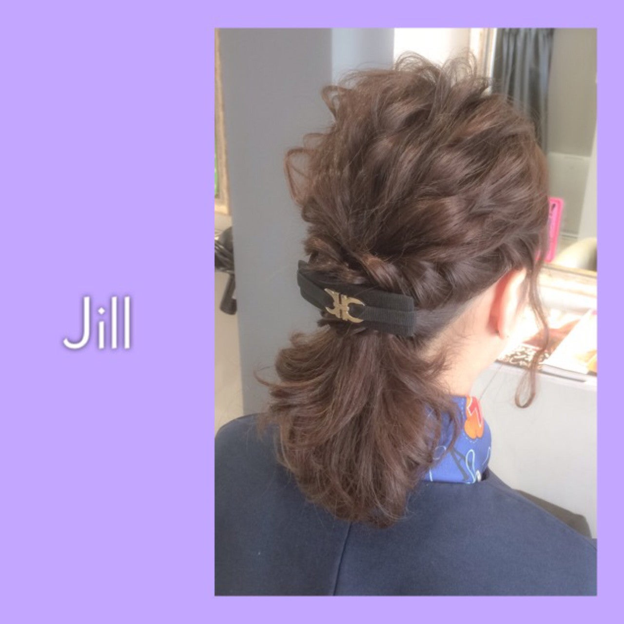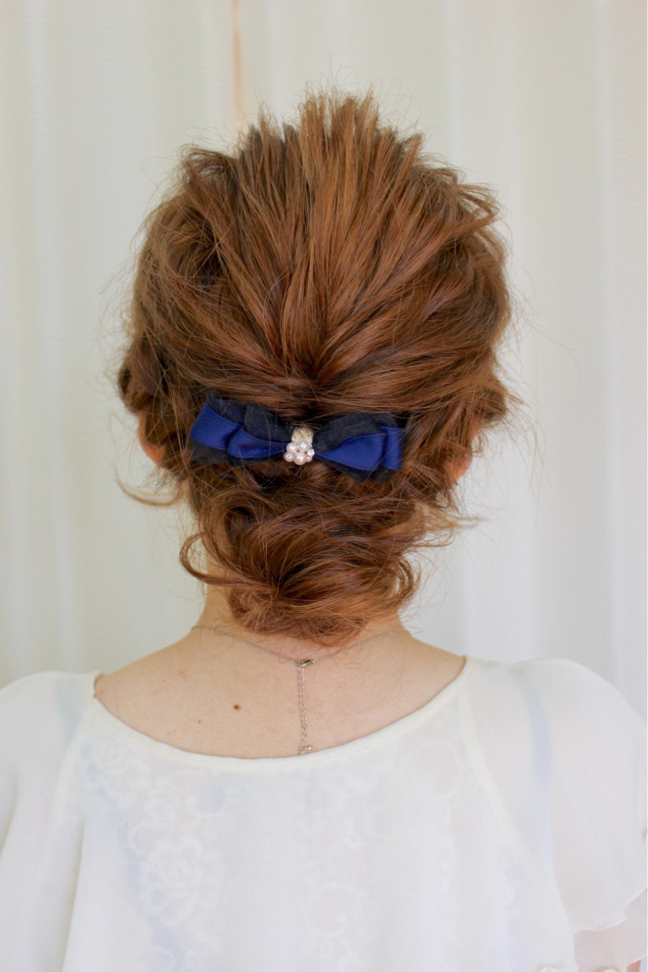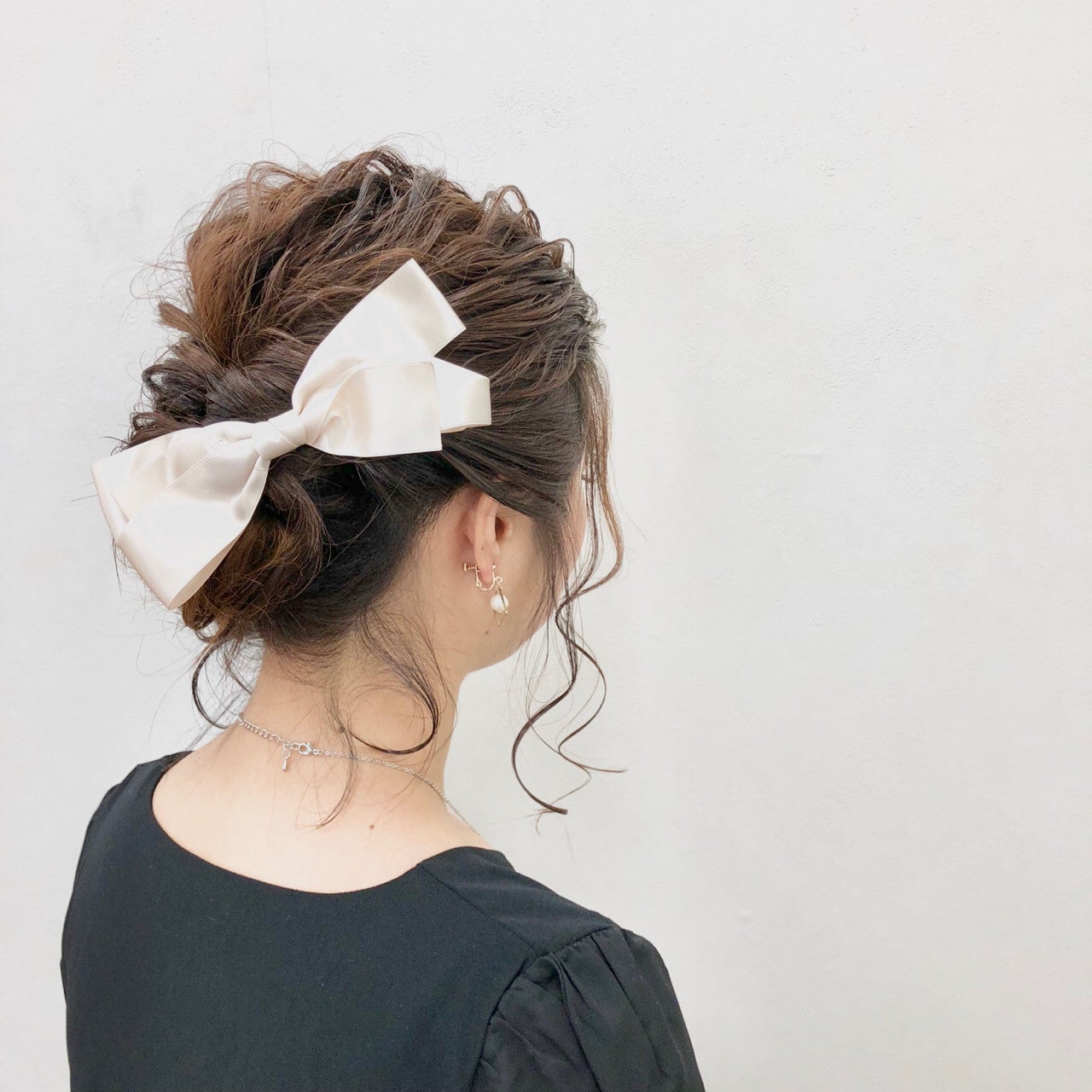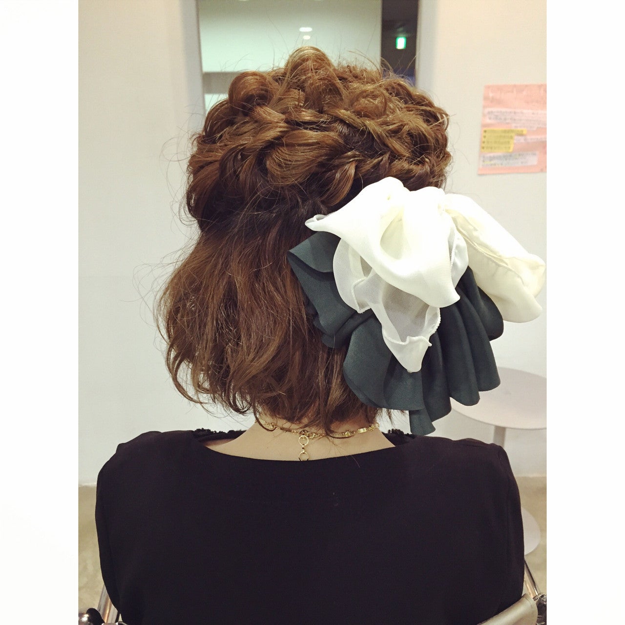 ふんわりまとめたバックと、サイドのねじりをひとつにまとめて、ゴム部分にバレッタをつけて☆