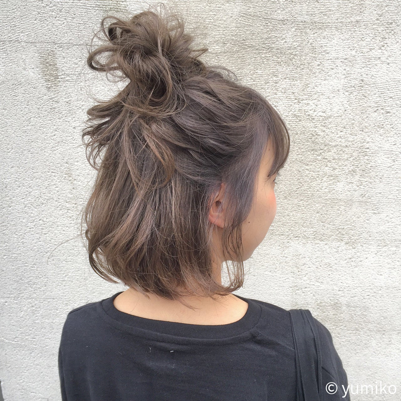 こなれでラフな印象のハーフアップお団子は、リラックスした飾らない雰囲気が魅力のヘアスタイル。