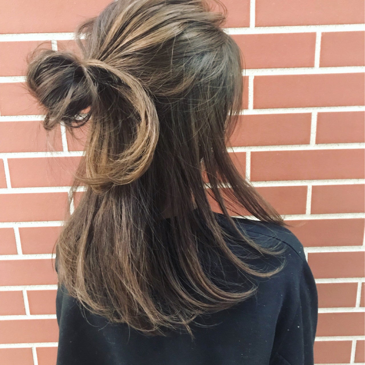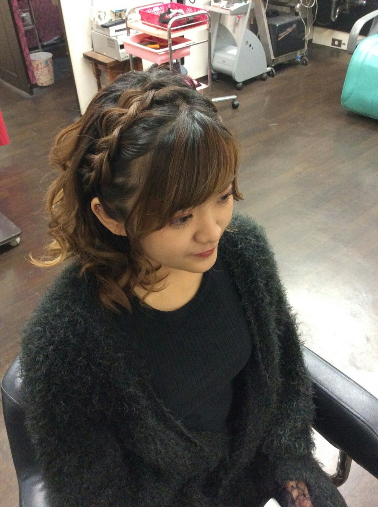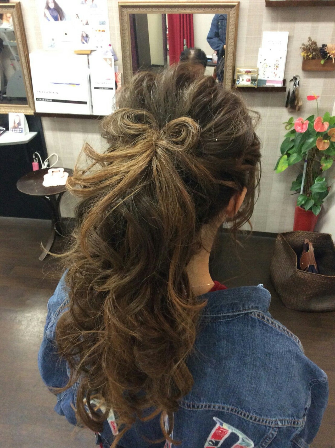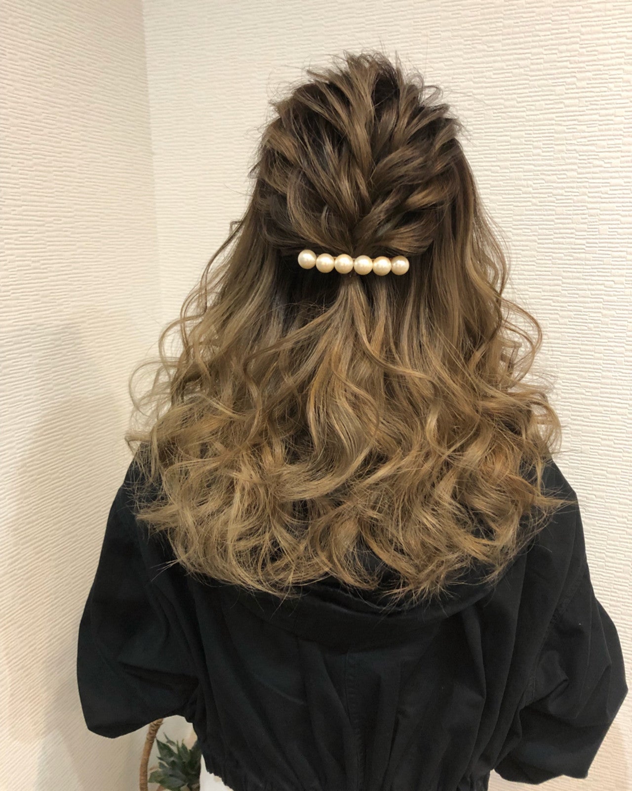 毛先を大きく巻いたハーフアップのアレンジです。華やかでフェミニンな仕上がりになります。