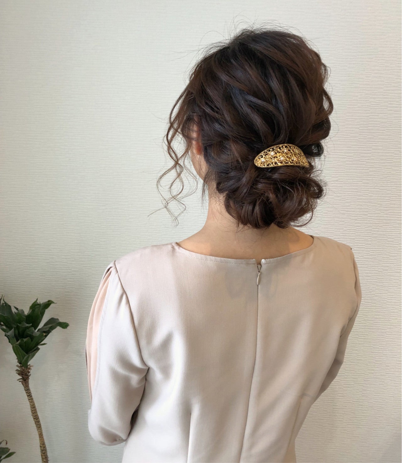 品のあるアップスタイルです。全体を巻いてからつくるのがポイントです。ヘアアクセ次第で印象が大きく変わりますよ。