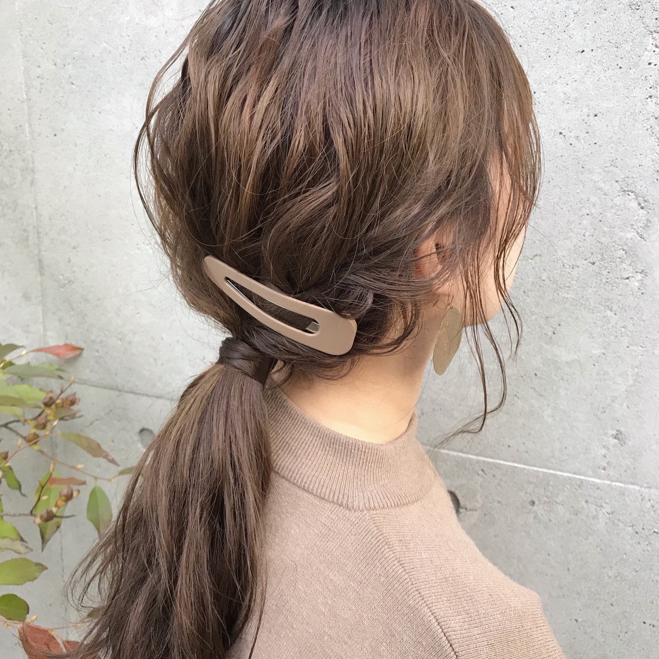ほんの少し高めの位置でざっくりとポニーテールしましょう。顔周りと毛先を巻いてストリートガーリーな雰囲気になりますよ。