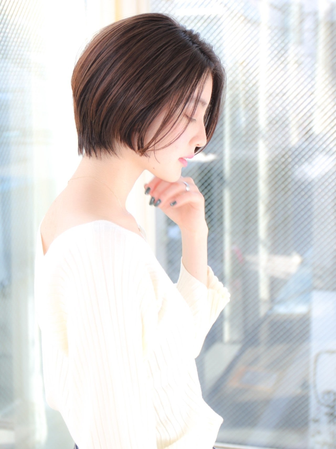 柔らかいニュアンスが加わることで、フェミニンながらクールさも兼ね備えたハンサムショートに。ウェットな質感で透け感プラスで色っぽくも♪
