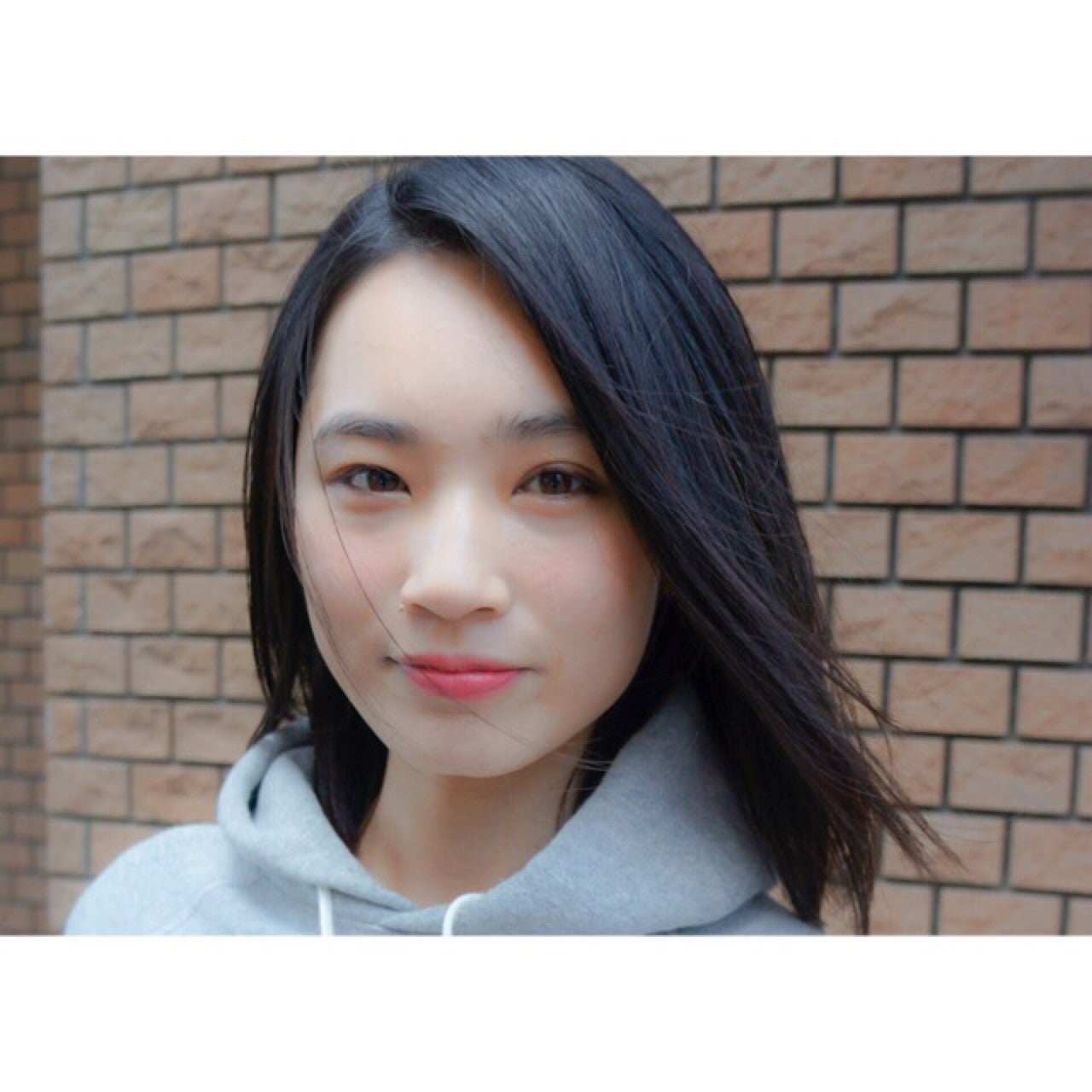 前髪なしのナチュラルストレートのミディアムヘアです。髪の美しさが際立ちますね。