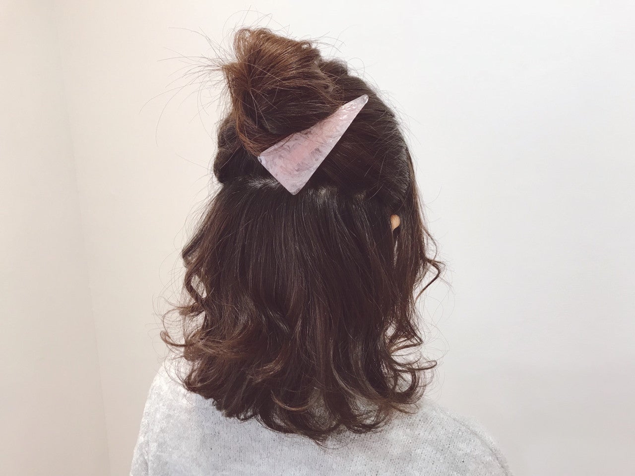 ハーフアップのお団子に、大きめのヘアアクセをアクセントにしています。