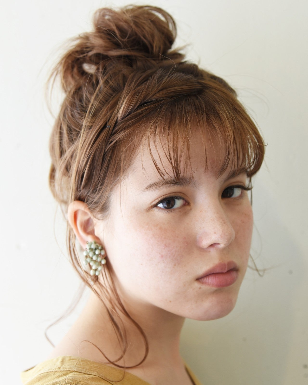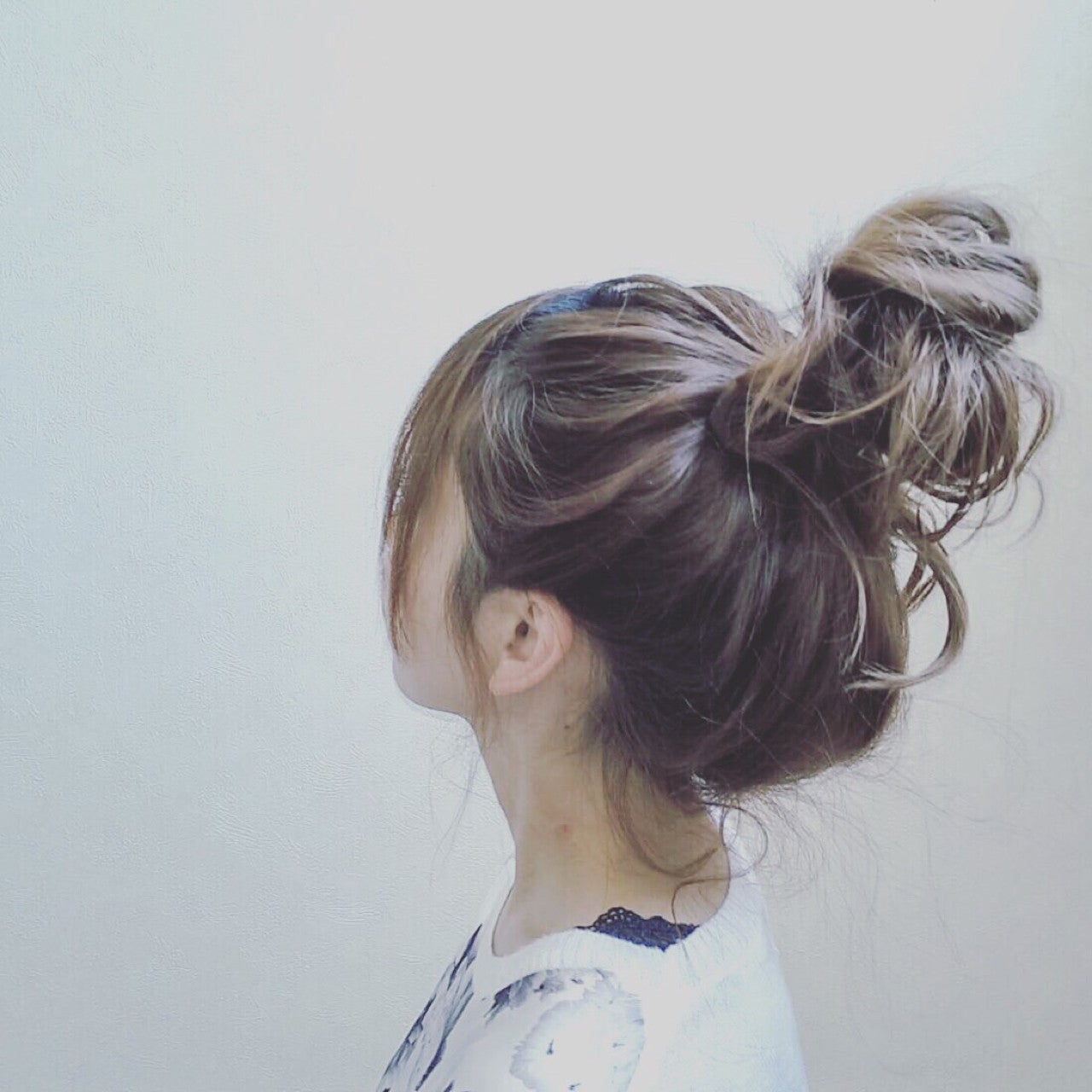 セミロングをラフなお団子ヘアにしています。後れ毛がポイントのこなれたアレンジです。