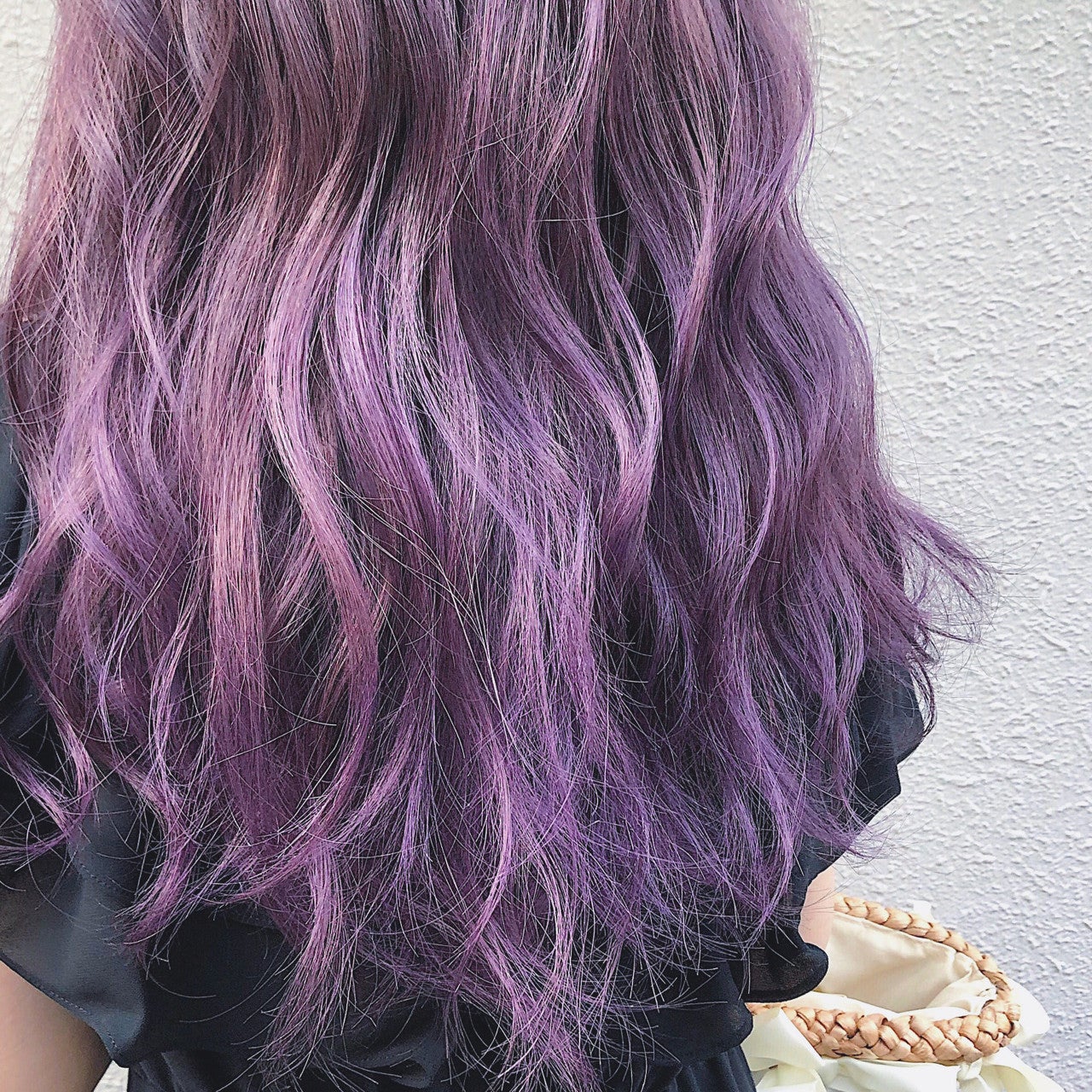ブリーチを数回行いしっかりと脱色した上にラベンダーカラーを入れると透明感のある派手髪に。