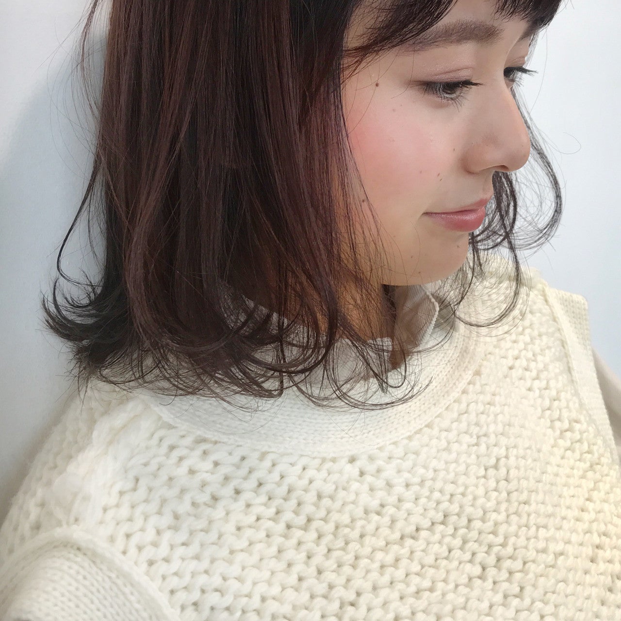 ナチュラルなミディアムヘアを透け感のあるショコラカラーで仕上げています。
