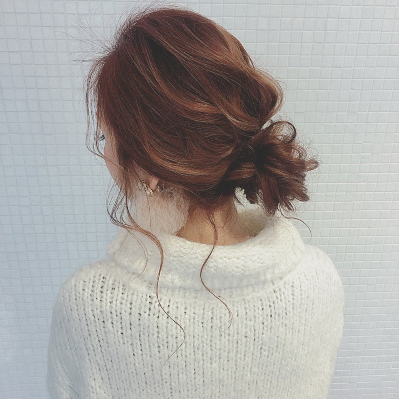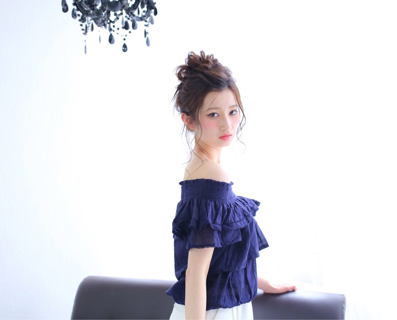 ガーリーな印象になりがちな高めのお団子ヘアも後れ毛を出すとフェミニンで色っぽい印象に変化。大人可愛いをつくれます♪