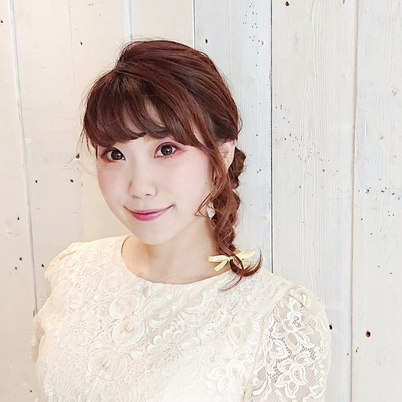 ミディアムヘアをサイドで三つ編みにアレンジしています。毛先までカールしておくのがポイントです。