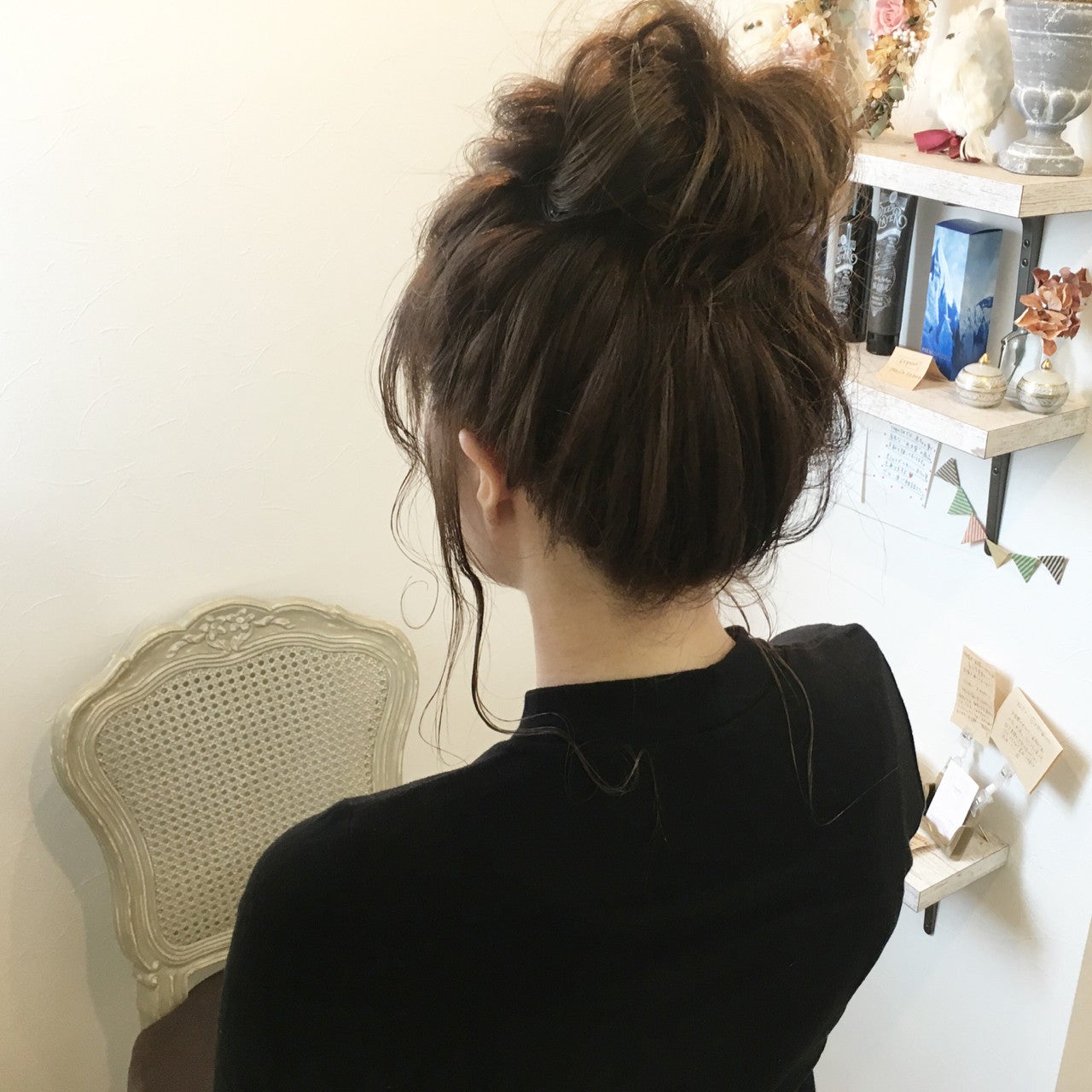 ふんわりガーリーな高めのお団子アレンジです。伸ばしかけのミディアムでもつくれますよ。
